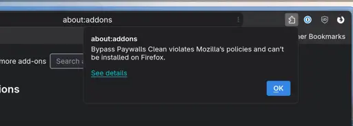 Looking for help here. I created a new Firefox profile and wanted to load the Bypass Paywalls Clean Add-on/Extension from the XPI file. So I did what I’ve always done and got the message displayed above.